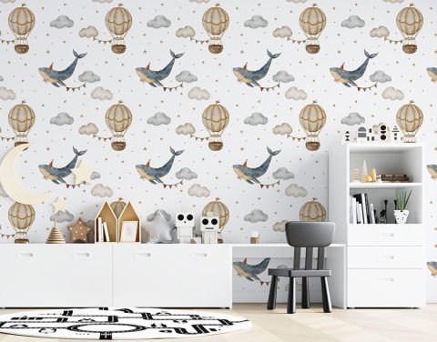 Mavi Balina ve Sıcak Hava Balonları Çocuk Bebek Odası Duvar Kağıdı