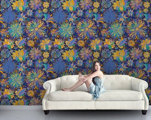 Vintage Mavi Çiçek Tasarımlı Duvar Kağıdı